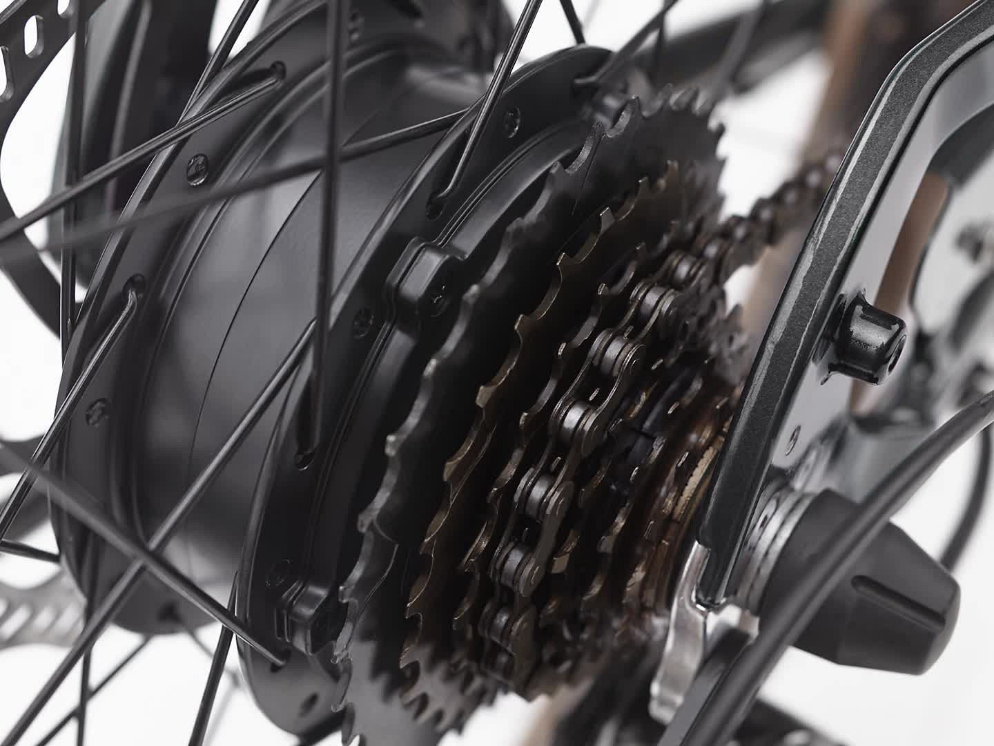 Легкая и прочная рама из алюминия 6061-T6 с высокой посадкой и вилка Uni-crown из высокопрочной стали создают устойчивость и надежность на дороге. Батарея аккуратно спрятана в раме, что придает велосипеду элегантный и современный вид. Мотор Hyena мощностью 250 Вт, расположенный в задней втулке, оснащен тремя уровнями поддержки, позволяя вам легко преодолевать любые расстояния.