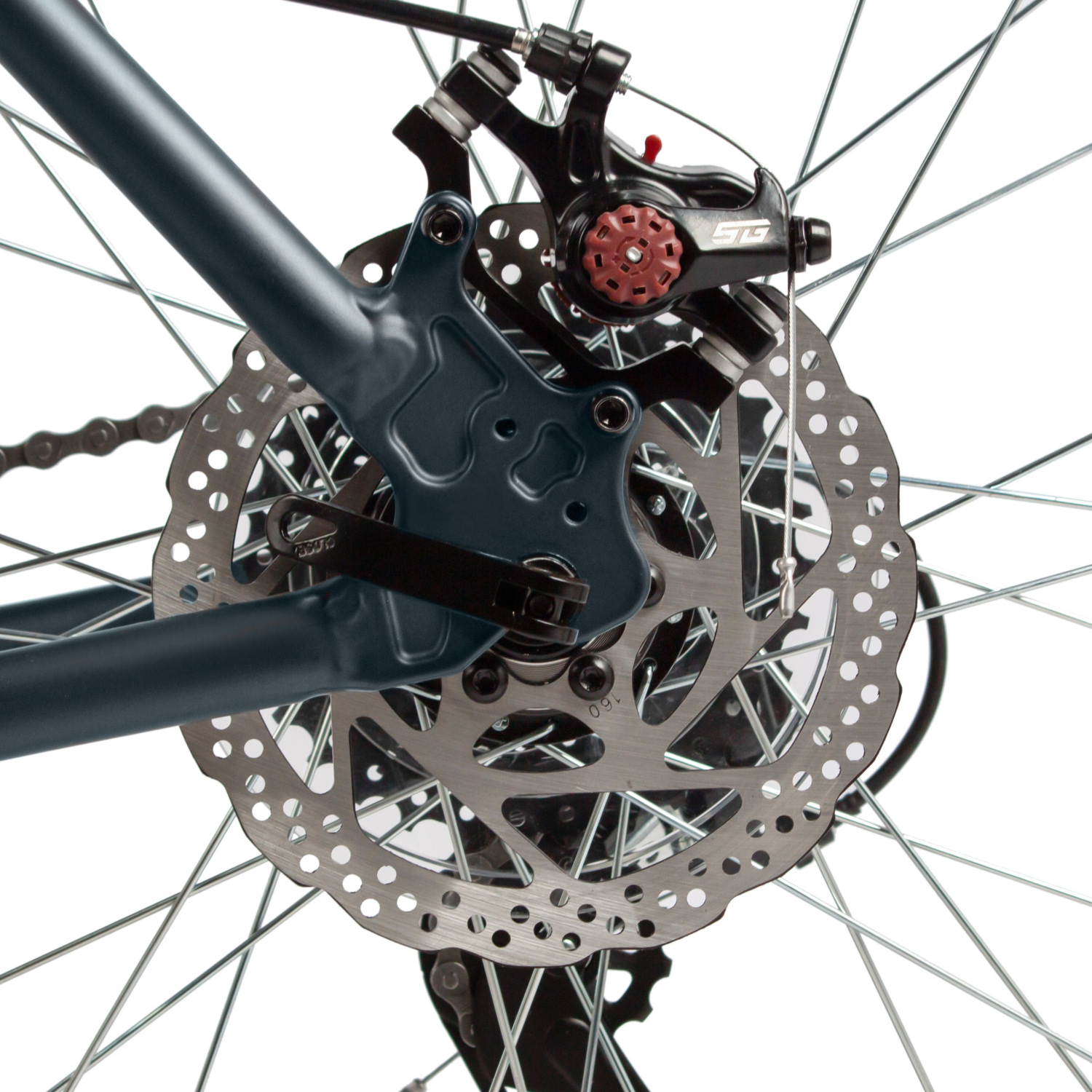 Дисковые механические тормоза STG с роторами 180/160 мм производят надёжную остановку, особенно на сложных участках. Дисковые втулки на быстросъёмных эксцентриках и покрышки ZX Sporter 2.0 демонстрируют отличное сцепление и долговечность, позволяя уверенно кататься по различным поверхностям.