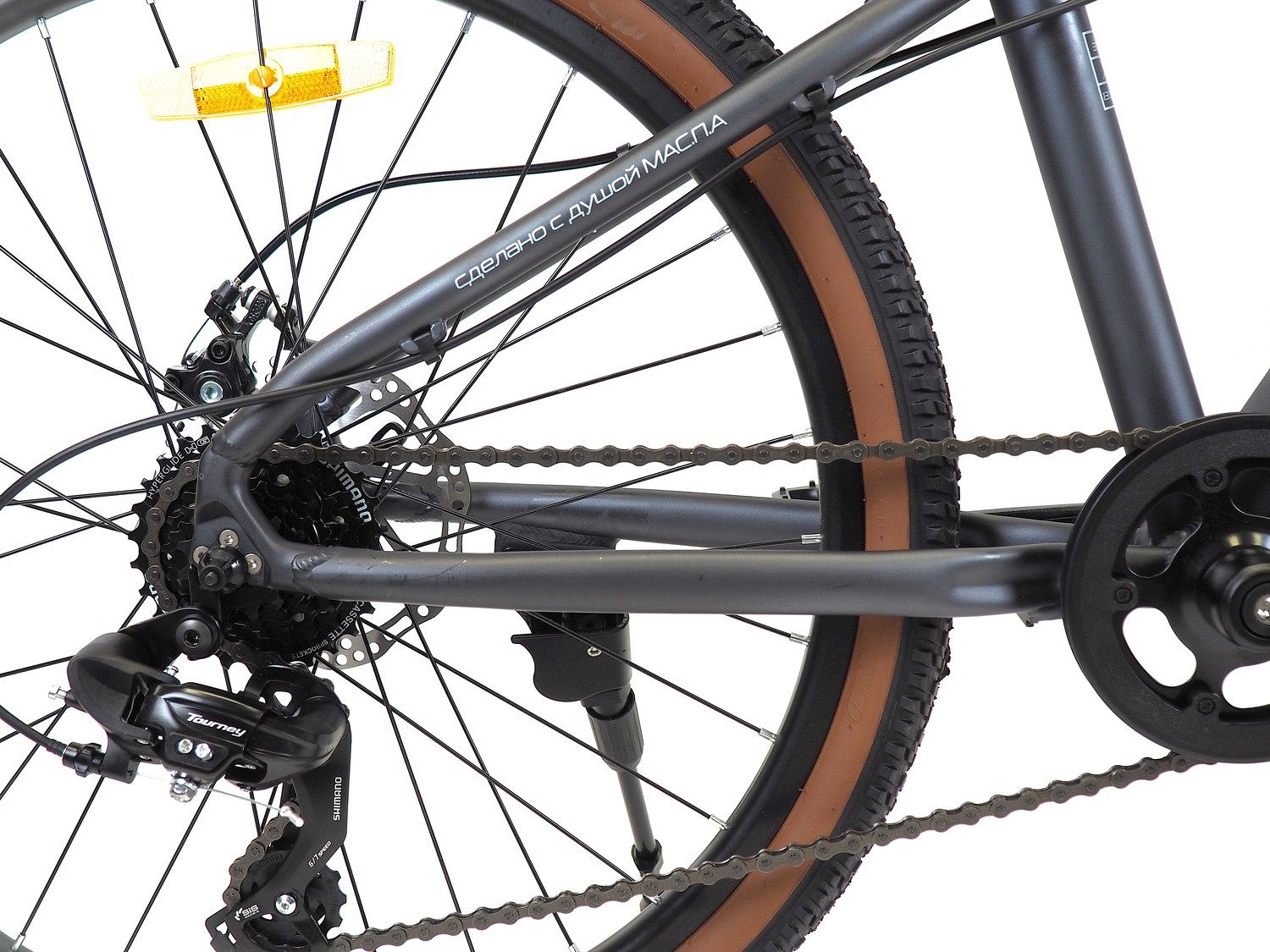 – 7-скоростная система Shimano Tourney. Позволяет подобрать передачу под разный рельеф.
