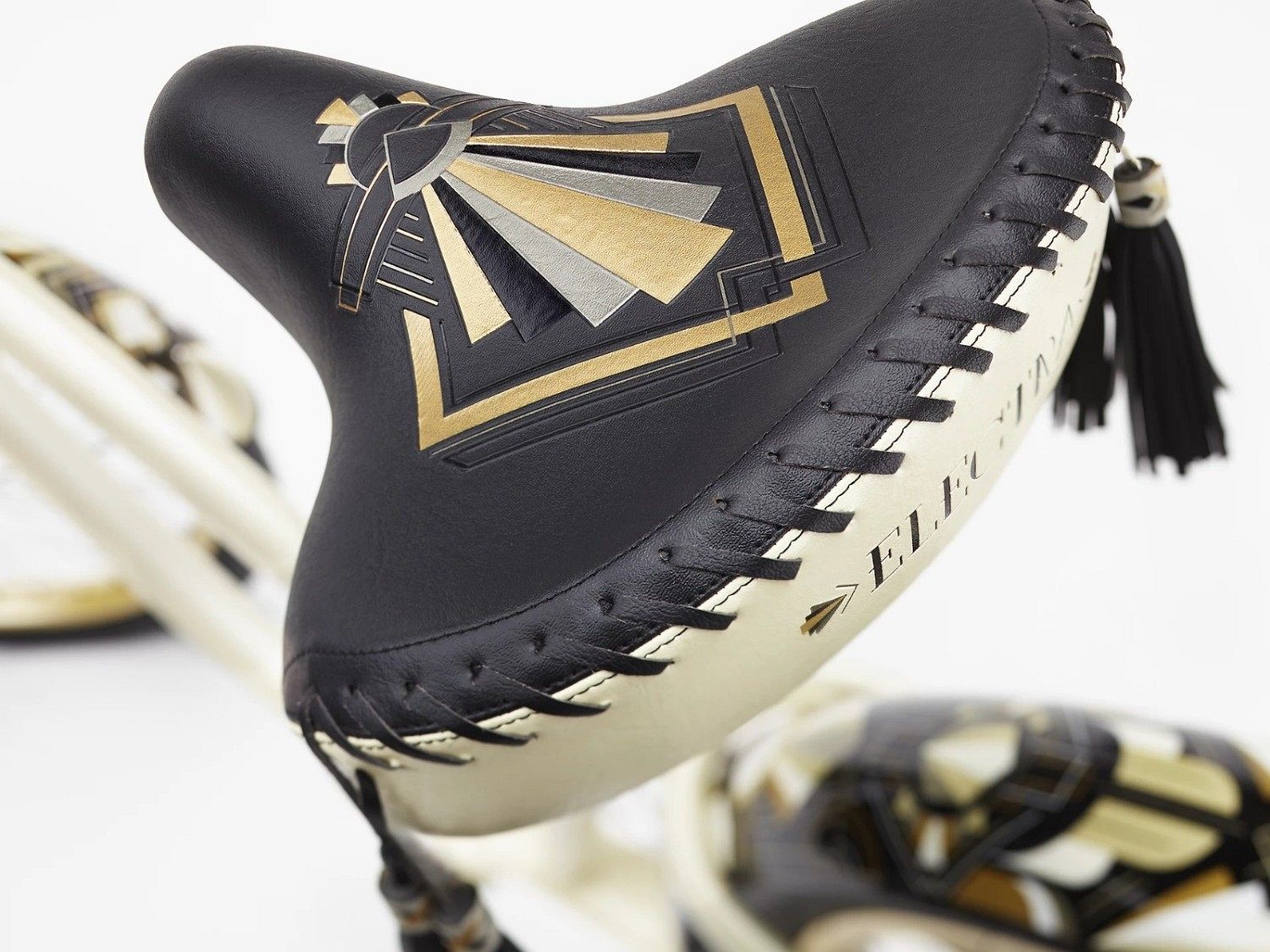 Перламутровая рама, украшенная сложными геометрическими элементами цвета металлик, характерными для стиля ар-деко, делает Zelda 3i настоящим произведением искусства. Каждый элемент этого велосипеда продуман до мелочей, чтобы создать неповторимый образ, вдохновленный сверкающей роскошью прошлого века.